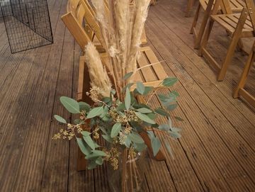 Our genuine pampas grass is 80cms in height, so when placed into a 50cm clear vase and complimented by the artificial eucalyptus leaves, they jointly provide greenery and height as centrepiece