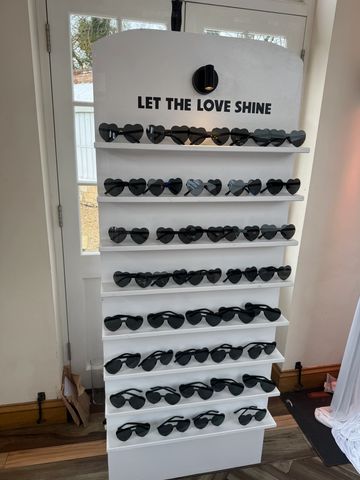Stand with 50 fun sunglasses of your colour choice. We have created two of these pieces so if you require this for 100 or slightly less guests, we would offer both for an additional £100, making a total of £350. All sunglasses are kept by the guests or couple.
